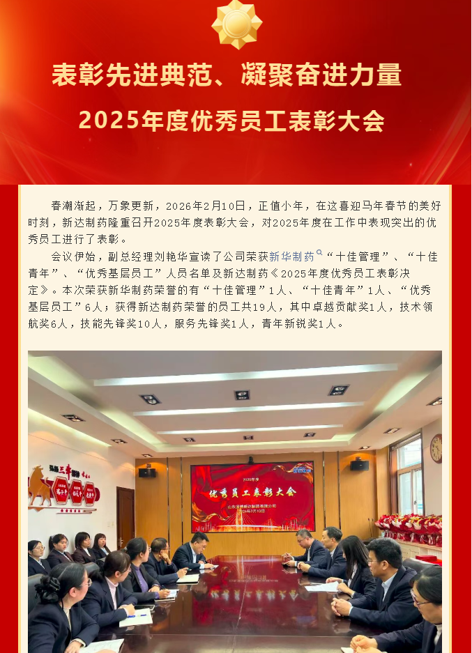 公司新闻 山东淄博新达制药有限公司 首页>>新闻中心>>公司新闻 表彰先进典范、凝聚奋进力量 发布时间:2026-02-11 上一篇:安全活动齐开展,筑牢防线保生产——安全月新达制药开展系列活动 下一篇:新达制药给您拜年啦!